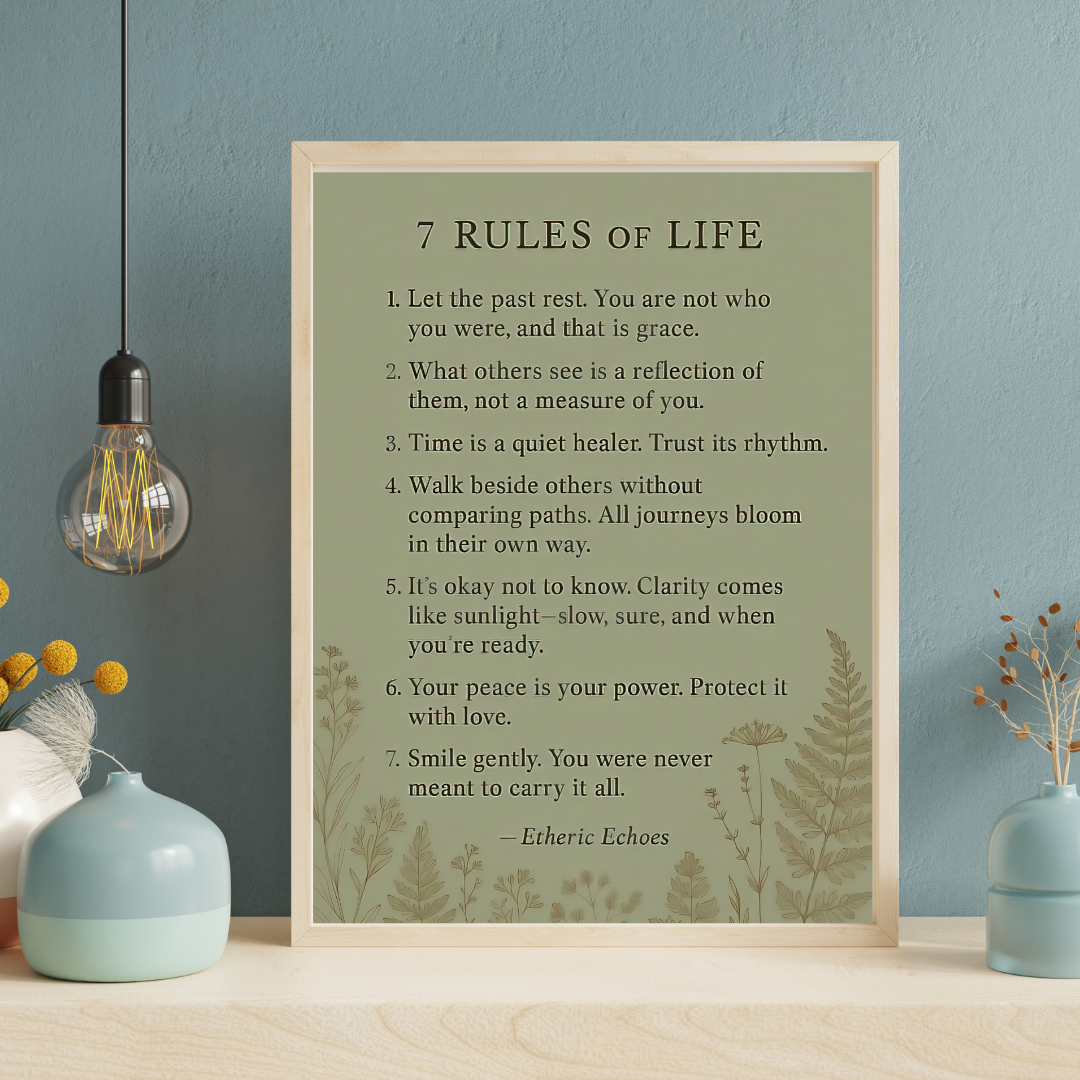 Transform your living space with the 7 Rules of Life Poster Inspirational Quote Wall Art from Etheric Echoes, designed to promote peaceful living, self-growth, and a mindful atmosphere. This exquisite piece serves as a daily reminder to slow down and cultivate inner tranquility, making it an ideal addition to bedrooms, therapy offices, reading nooks, and any quiet corner of your home.